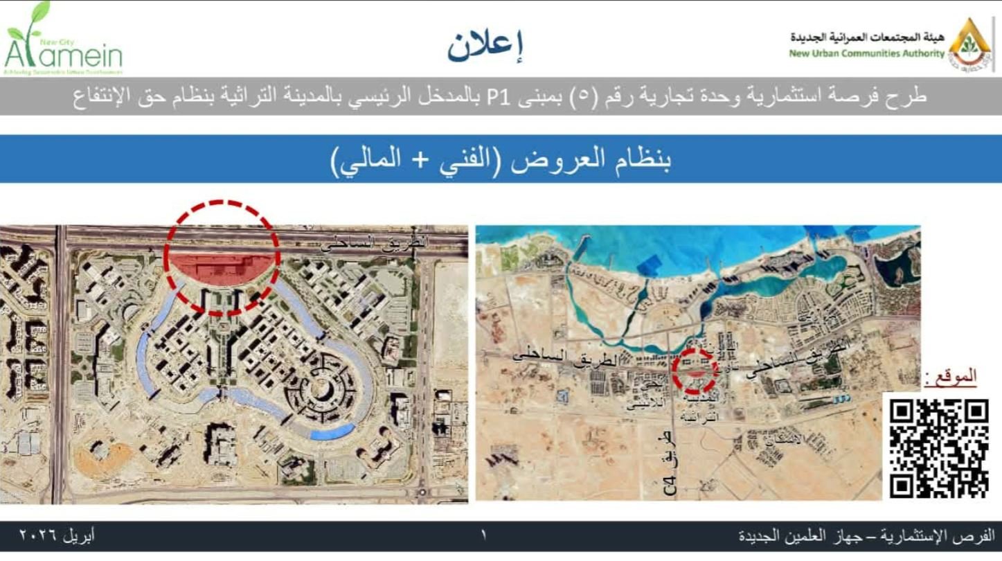 أعلن الدكتور مهندس محمد خلف الله، رئيس جهاز مدينة العلمين الجديدة والمشرف على جهاز القرى السياحية، طرح عدد من الفرص الاستثمارية داخل المدينة التراثية بنظام "حق الانتفاع"، وذلك بنظام العروض، فى خطوة تعكس بدء مرحلة جديدة من الاستثمار داخل أحد أهم المشروعات الحضارية بالمدينة.