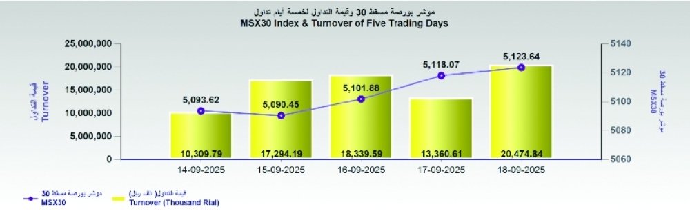 كتب - خليل بن أحمد الكلباني -سجل مؤشر بورصة مسقط اليوم ارتفاعا بمقدار 5.6 نقطة، وأغلق عند حاجز 5123.64 نقطة، وبلغت قيمة التداول 20.4 مليون ريال عماني، وبلغت القيمة السوقية 30.1 ملي.