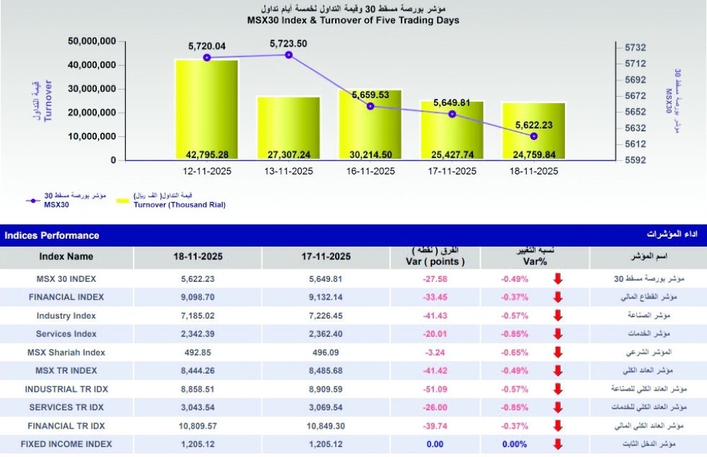أغلق اليوم مؤشر بورصة مسقط عند 5622.23 نقطة منخفضا 27.6 نقطة، وبلغت قيمة التداول 24.760 مليون ريال منخفضة 2.6% مقارنة مع آخر جلسة تداول والتي سجلت 25.428 مليون ريال عماني، وبلغت ال.