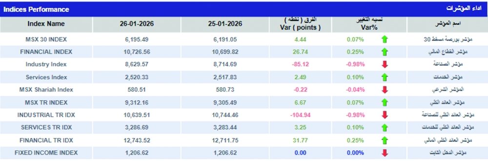 مؤشر بورصة مسقط يرتفع إلى 6195 نقطة مع تداولات تتجاوز 34.8 مليون ريال