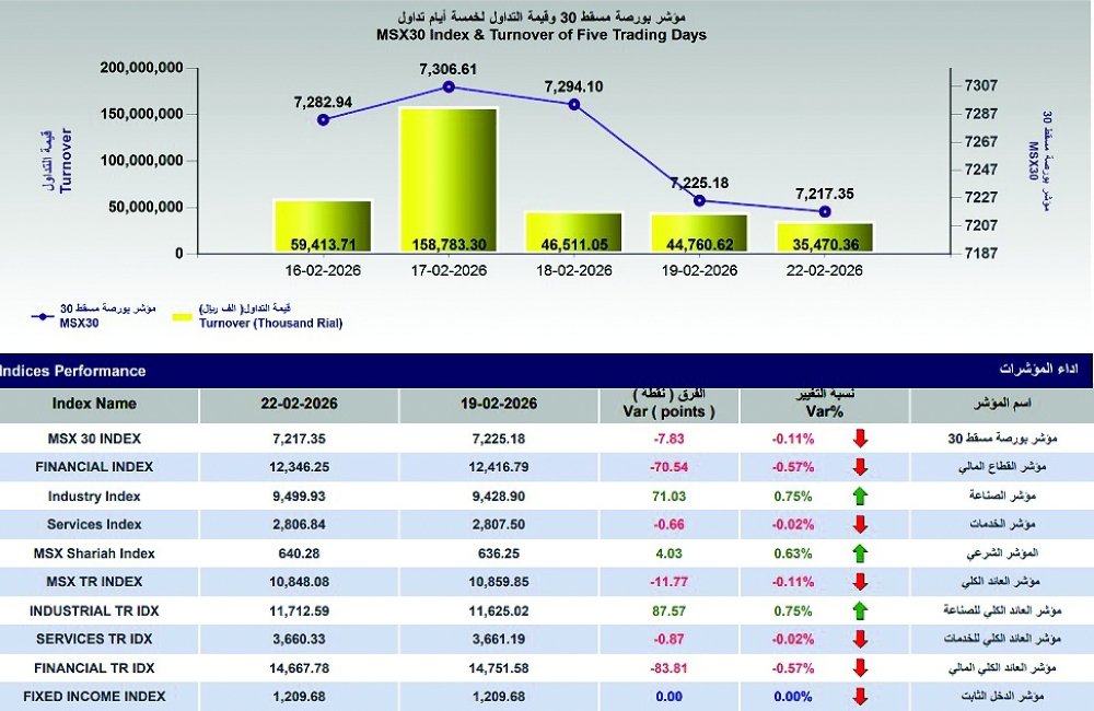 مؤشر بورصة مسقط يغلق عند 7217 نقطة ..و35.4 مليون ريال قيمة التداول