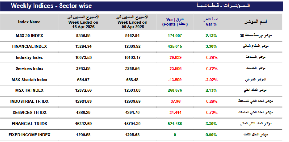 سجل المؤشر الأسبوعي لبورصة مسقط ارتفاعًا بمقدار 174 نقطة وبنسبة 2.1% ليغلق على 8336.85 نقطة، مقارنة مع مؤشر الأسبوع المنتهي في 9 إبريل، الذي أغلق عند مستوى 8162.84 نقطة. وارتفعت قي.