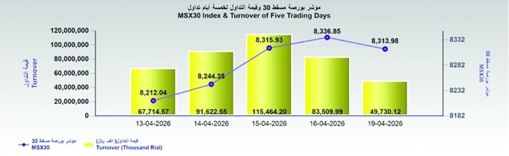 أغلق مؤشر بورصة مسقط اليوم منخفضًا بمقدار 22.9 نقطة، وأغلق عند مستوى 8313.9 نقطة، وبلغت قيمة التداول 49.7 مليون ريال عُماني منخفضة بنسبة 40.5% مقارنة مع آخر جلسة تداول، والمغلقة عن.