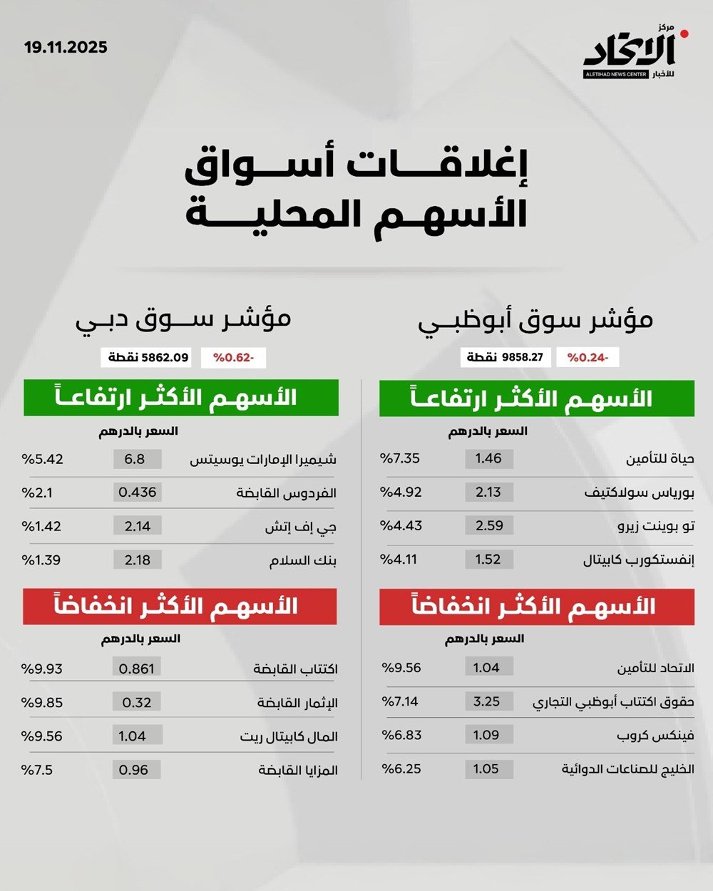 وتصدّر سهم «العالمية القابضة» قائمة الأكثر نشاطاً من حيث القيمة بنحو 533.33 مليون درهم، وتلاه سهم «أدنوك للإمداد» بقيمة 124 مليون درهم، ثم «تو بوينت زيرو» بقيمة 89.21 مليون درهم. وجاء سهم «توبوينت زيرو» الأكثر نشاطاً من حيث الكمية بنحو 34.8 مليون سهم، وتلاه سهم «أدنوك للغاز» بتداول 25.81 مليون سهم، ثم «أدنوك للتوزيع» بنحو 22.5 مليون سهم.