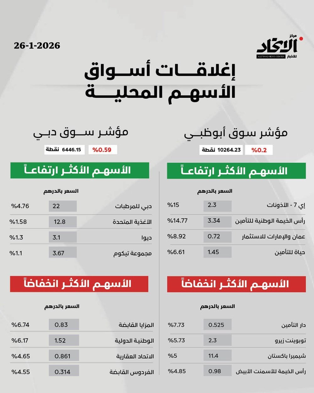 وسجّل المؤشر العام لسوق أبوظبي انخفاضاً بمقدار 21.5 نقطة وبنسبة 0.2% عند مستوى 10264.23 نقطة. وبلغت قيمة التداولات الإجمالية 1.26 مليار درهم، شملت ما يزيد على 274.34 مليون سهم عبر 24226 صفقة. وتصدّر سهم «مصرف أبوظبي الإسلامي» قائمة الأكثر نشاطاً من حيث القيمة بنحو 248.61 مليون درهم، وتلاه سهم «الدار» بقيمة 140.47 مليون درهم، ثم «ألفا ظبي القابضة» بقيمة 102.11 مليون درهم. وجاء سهم «دانة غاز» الأكثر نشاطاً من حيث الكمية بنحو 33.14 مليون سهم، وتلاه سهم «أدنوك للغاز» بتداول 19.77 مليون سهم، ثم «فيرتيغلوب» بنحو 19.39 مليون سهم. وتضمّنت قائمة الأسهم النشطة المرتفعة «مصرف الشارقة الإسلامي» بنسبة 2.66% ليغلق عند 3.47 درهم، و«مصرف أبوظبي الإسلامي» بنسبة 1.31% إلى 23.1 درهم، وسهم «دانة غاز» بنسبة 0.74% إلى 0.95 درهم، و«فيرتيغلوب» بنسبة 1.89% إلى 2.69 درهم، وفي المقابل انخفضت أسهم نشطة مثل أسهم «ألفا ظبي القابضة» بنسبة 0.96% إلى 9.27 درهم، «بنك أبوظبي الأول» بنسبة 0.74% إلى 18.76 درهم، و«أدنوك للغاز» بنسبة 0.28% إلى 3.55 درهم، وكذلك «توبوينت زيرو» بنسبة 5.73% إلى 2.3 درهم.