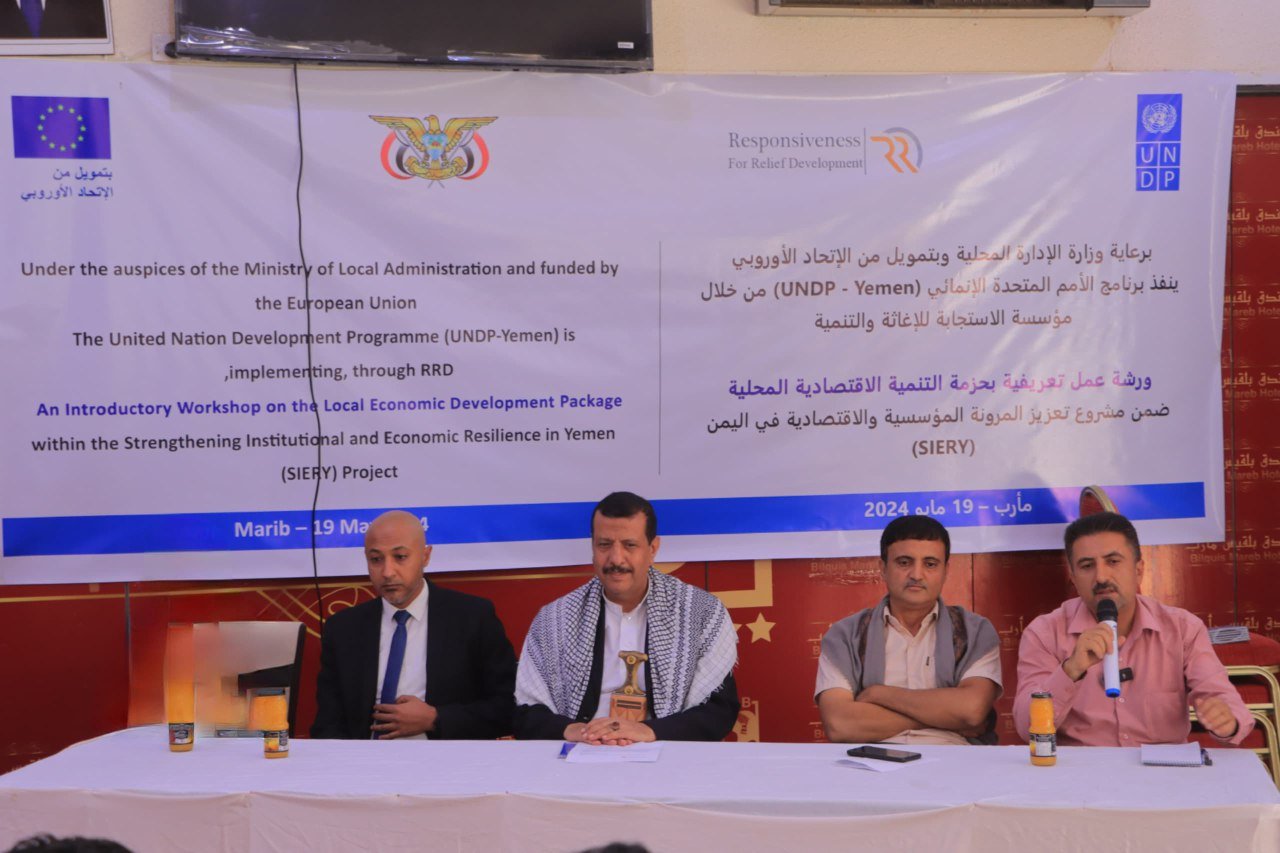 عقدت في محافظة مأرب، اليوم، ورشة عمل تعريفية بحزمة التنمية الاقتصادية ضمن مشروع تعزيز المرونة المؤسسية والاقتصادية في اليمن (SIERY) التابع لبرنامج الأمم المتحدة الإنمائي والممول من الاتحاد الأوروبي