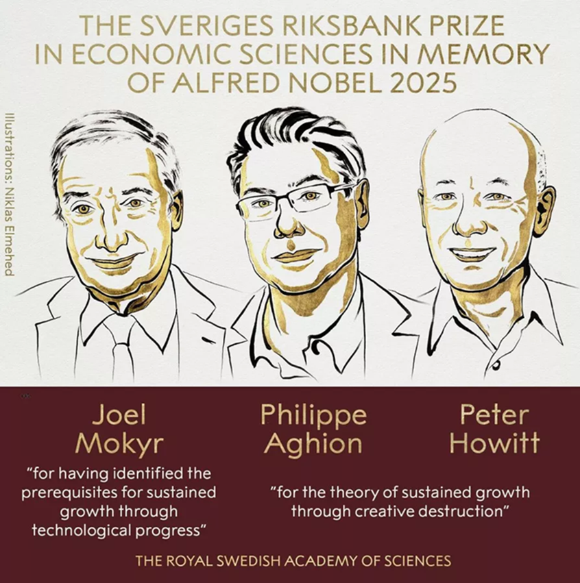 أعلنت الأكاديمية الملكية السويدية للعلوم في ستوكهولم اليوم منح جائزة نوبل في العلوم الاقتصادية لكل من البروفيسور جويل موكير، والبروفيسور فيليب أغيون، والبروفيسور بيتر هويت.