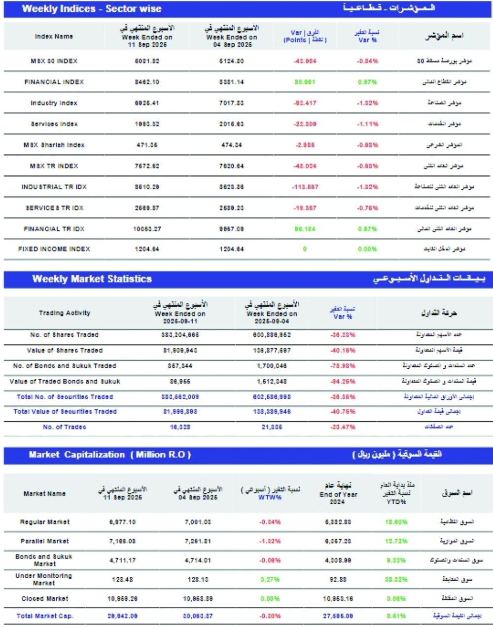 مؤشر بورصة مسقط الأسبوعي يفقد 42.9 نقطة .. والتداول 81.9 مليون ريال