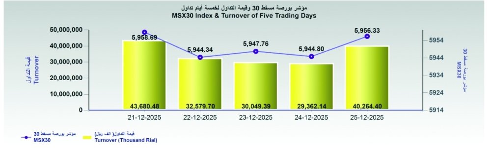 مؤشر بورصة مسقط يغلق عند حاجز 5956 نقطة وتباين أداء القطاعات الرئيسية