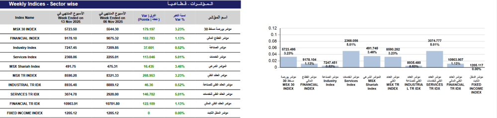 سجل المؤشر الأسبوعي لبورصة مسقط ارتفاعًا بمقدار 179.1 نقطة ليغلق على 5723.50 نقطة، مقارنة مع مؤشر الأسبوع المنتهي في 6 نوفمبر، الذي أغلق عند مستوى 5544.30 نقطة.وارتفعت قيمة التداول...