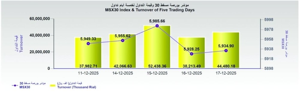 بورصة مسقط تغلق عند مستوى 5934 نقطة .. والتداولات 44 مليون ريال