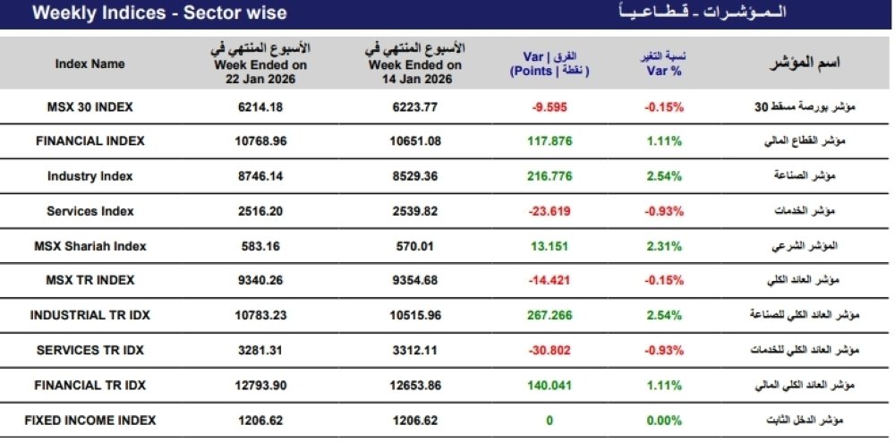 سجل المؤشر الأسبوعي لبورصة مسقط انخفاضا بمقدار 9.5 نقطة ليغلق على 6214.18 نقطة، مقارنة مع مؤشر الأسبوع المنتهي في 14 يناير، الذي أغلق عند مستوى 6223.77 نقطة. وانخفضت قيمة التداول ب.