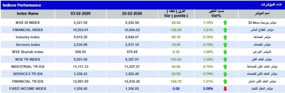 سجّل مؤشر بورصة مسقط ارتفاعًا بمقدار 68.9 نقطة، وأغلق عند حاجز 6321.52 نقطة، وبلغت قيمة التداول 36.274 مليون ريال عُماني، وبلغت القيمة السوقية 33.54 مليار ريال.وارتفعت المؤشرات الر...