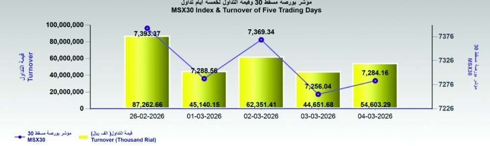 مؤشر بورصة مسقط يغلق عند حاجز 7284 نقطة وتداولات 54.6 مليون ريال