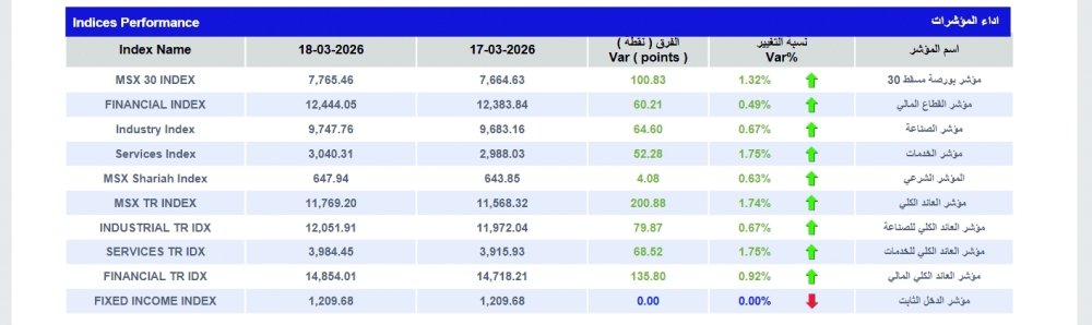 سجل مؤشر بورصة مسقط ارتفاعا بمقدار 100.8 نقطة وبنسبة 1.316% مقارنة مع آخر جلسة تداول، وأغلق عند حاجز 7765.46 نقطة، وبلغت قيمة التداول 70.073 مليون ريال عماني مرتفعة بنسبة 93.6% عن.