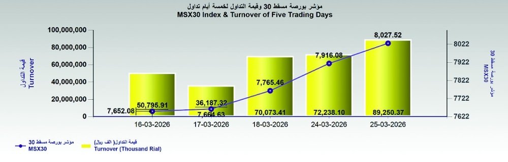 بورصة مسقط تكسر حاجز 8027 نقطة والتداولات 89.2 مليون ريال