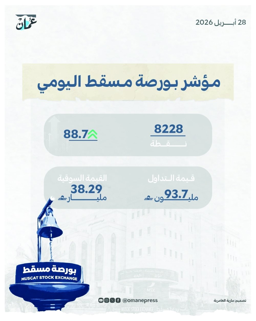 سجل مؤشر بورصة مسقط ارتفاعاً بمقدار 88.7 نقطة، وأغلق عند حاجز 8228.20 نقطة، وبلغت قيمة التداول 93.792 مليون ريال عماني، وبلغت القيمة السوقية 38.29 مليار ريال.وارتفعت معظم المؤشرات...