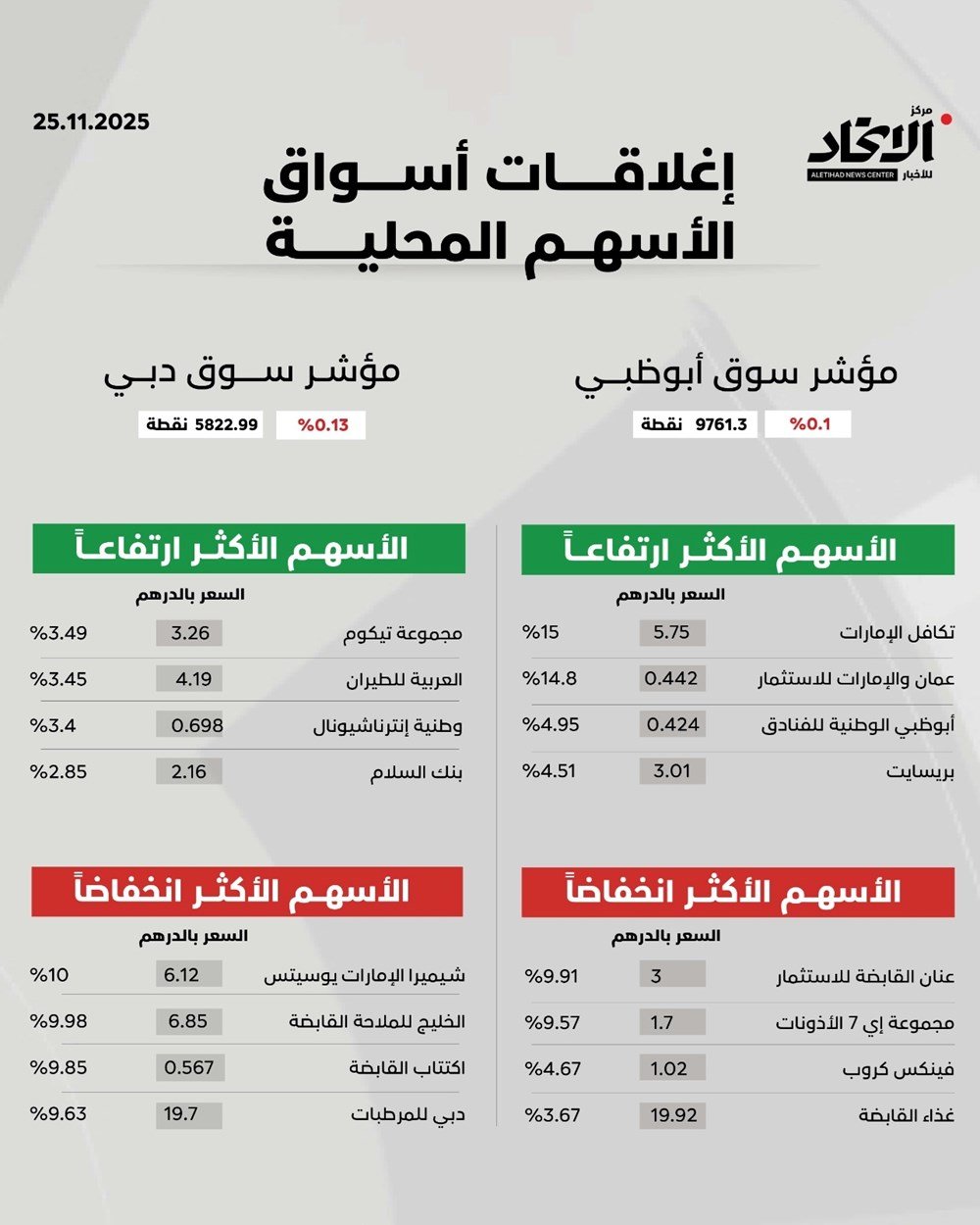 وتضمّنت قائمة الأسهم النشطة المرتفعة كلاً من «الإمارات دبي الوطني» بنسبة 0.61% إلى 24.75 درهم، و«العربية للطيران» بنسبة 3.45% ليغلق السهم عند 4.19 درهم، وأيضاً «مجموعة تيكوم» بنسبة 3.49% ليغلق عند 3.26 درهم، و«سلامة للتأمين» بنسبة 2.68% إلى 0.42 درهم، و«بنك دبي الإسلامي» بنسبة 1.09% إلى 9.2 درهم، وفي المقابل انخفضت أسهم نشطة مثل «اعمار العقارية» بنسبة 1.11% إلى 13.25 درهم، و«طلبات» بنسبة 1.4% إلى 0.841 درهم، و«الفردوس القابضة» بنسبة 3.73% إلى 0.387 درهم، و«الاثمار القابضة» بنسبة 1.14% إلى 0.259 درهم.