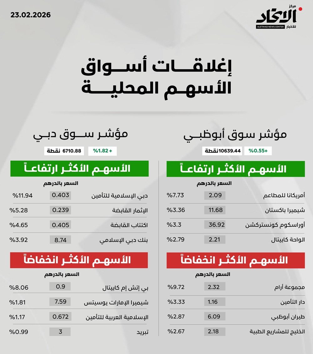 ارتفعت مؤشرات أسواق الأسهم المحلية في مستهل تعاملات الأسبوع، عقب تراجعات استمرت ليومين سابقين، وليغلق مؤشر سوق أبوظبي للأوراق المالية مرتفعاً بنسبة 0.55% وبنحو 58.59 إلى 10639.44 نقطة،