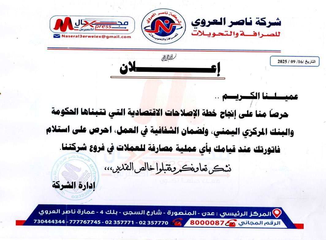 شركة ناصر العروي للصرافة تحث عملاءها على ضرورة استلام سندات المصارفة